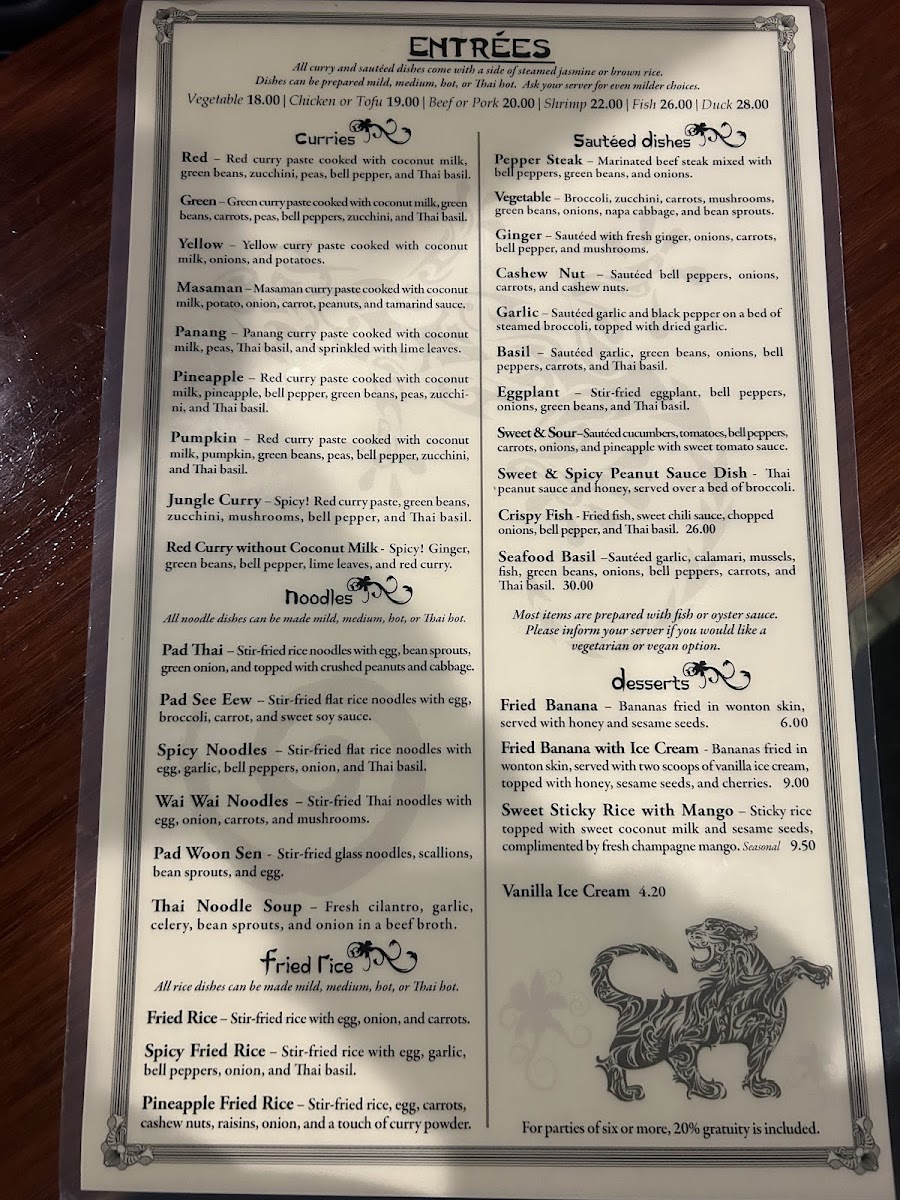 Red curry paste cooked with coconut milk, green beans, zucchini, peas, bell pepper, and ai basil.