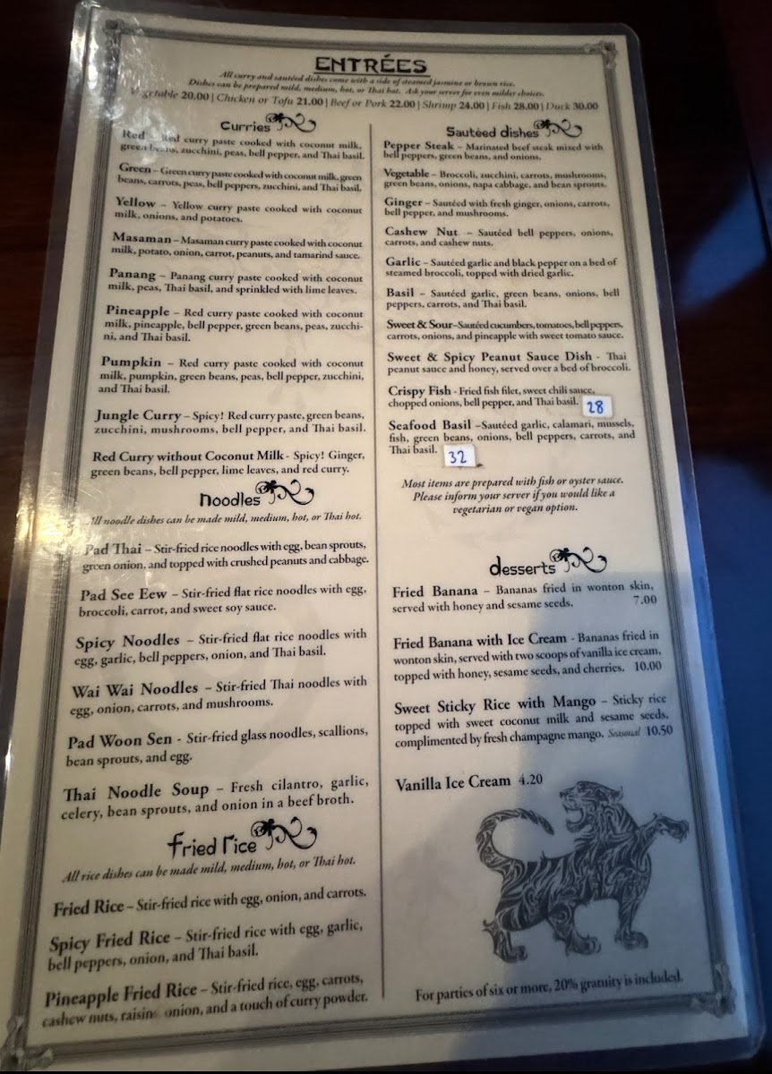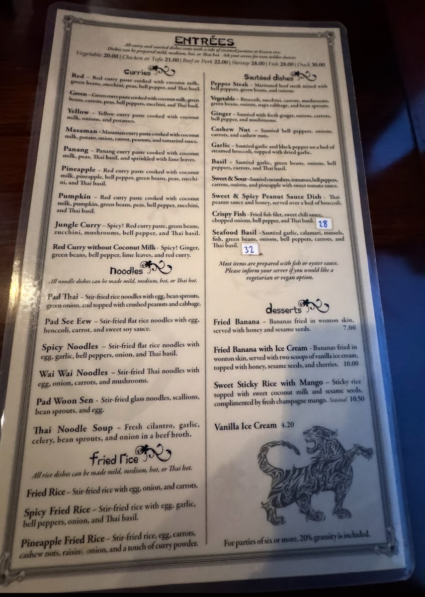 – Red curry paste cooked with coconut milk, pumpkin, green beans, peas, bell pepper, zucchini, and ai basil.
