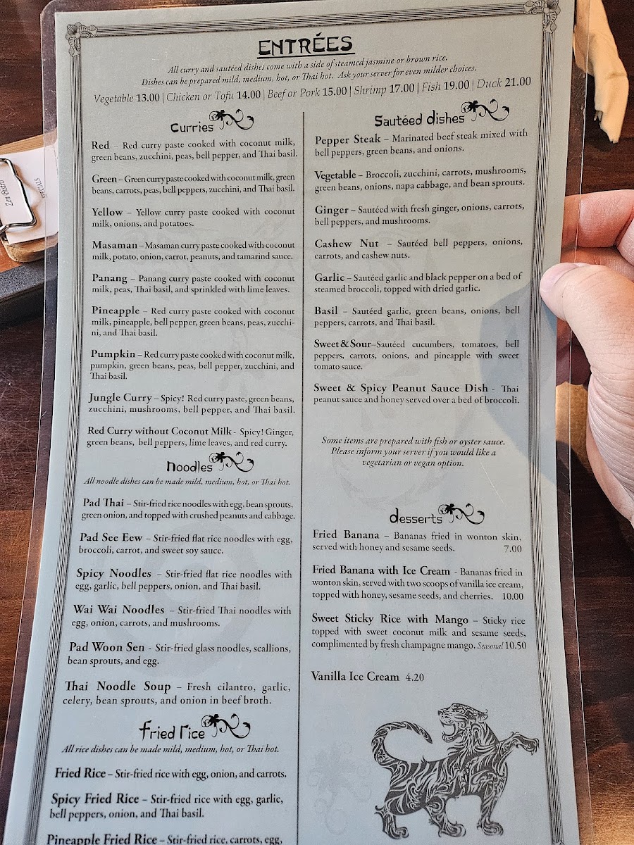 Green curry paste cooked with coconut milk, green beans, carrots, peas, bell peppers, zucchini, and ai basil.